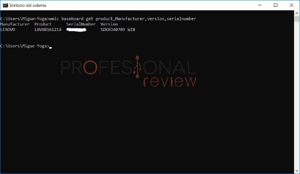 - Ahora, debes escribir el comando: "wmic baseboard get product manufacturer version serialnumber" sin las comillas.